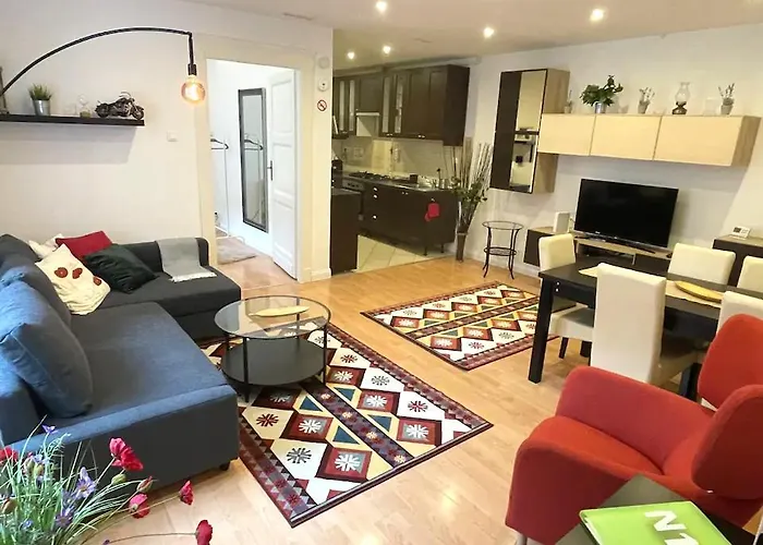 Situated nearly a 5-minute ride from the Blaha Lujza Square, the spacious 65 m² N16-Spacey, Modern Family Flat For 5 Budapest also boasts easy access to Nyugati train station which is only 1.7 km away.